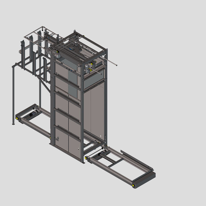 The DPL-500 is a more feature-rich version of the DPL-250 with higher speeds and more automation. It removes top racks, ejects empty pallets, and sweeps full layers onto a mass-accumulation conveyor before single-filing them for high-speed production.
