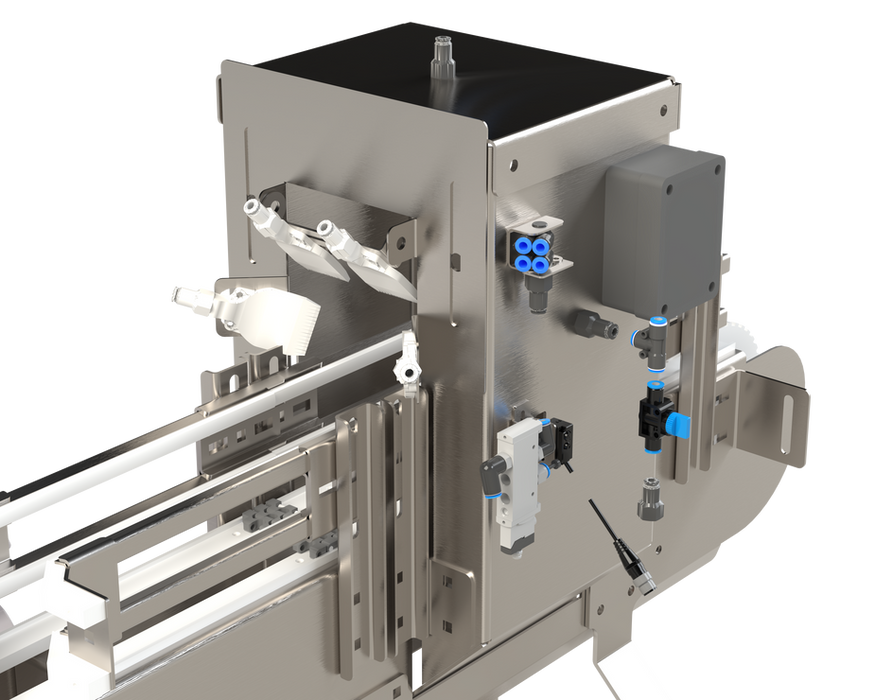 Wet or residue-covered cans going into pack-out or labeling create problems downstream. The Rinse Dry Box mounts inline to rinse the tops and sides of cans, then dries them using high-efficiency air nozzles powered by your existing facility compressor. No separate blower required. Integrated drip pans keep water off the floor. 304 stainless steel construction, standard 6.7" container clearance with modifications available for larger formats, and an adaptable mount that fits virtually any existing conveyor.